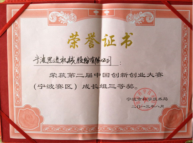 寧波思進機械股份有限公司在由國家科技部火炬中心、科技型中小企業(yè)技術(shù)創(chuàng)新基金管理中心主辦的第二屆中國創(chuàng)新創(chuàng)業(yè)大賽(寧波賽區(qū))的比賽中,經(jīng)過資格審核、初賽、復(fù)賽、決賽等環(huán)節(jié),在218家企業(yè)、18個項目團隊中脫穎而出,榮獲寧波賽區(qū)三等獎